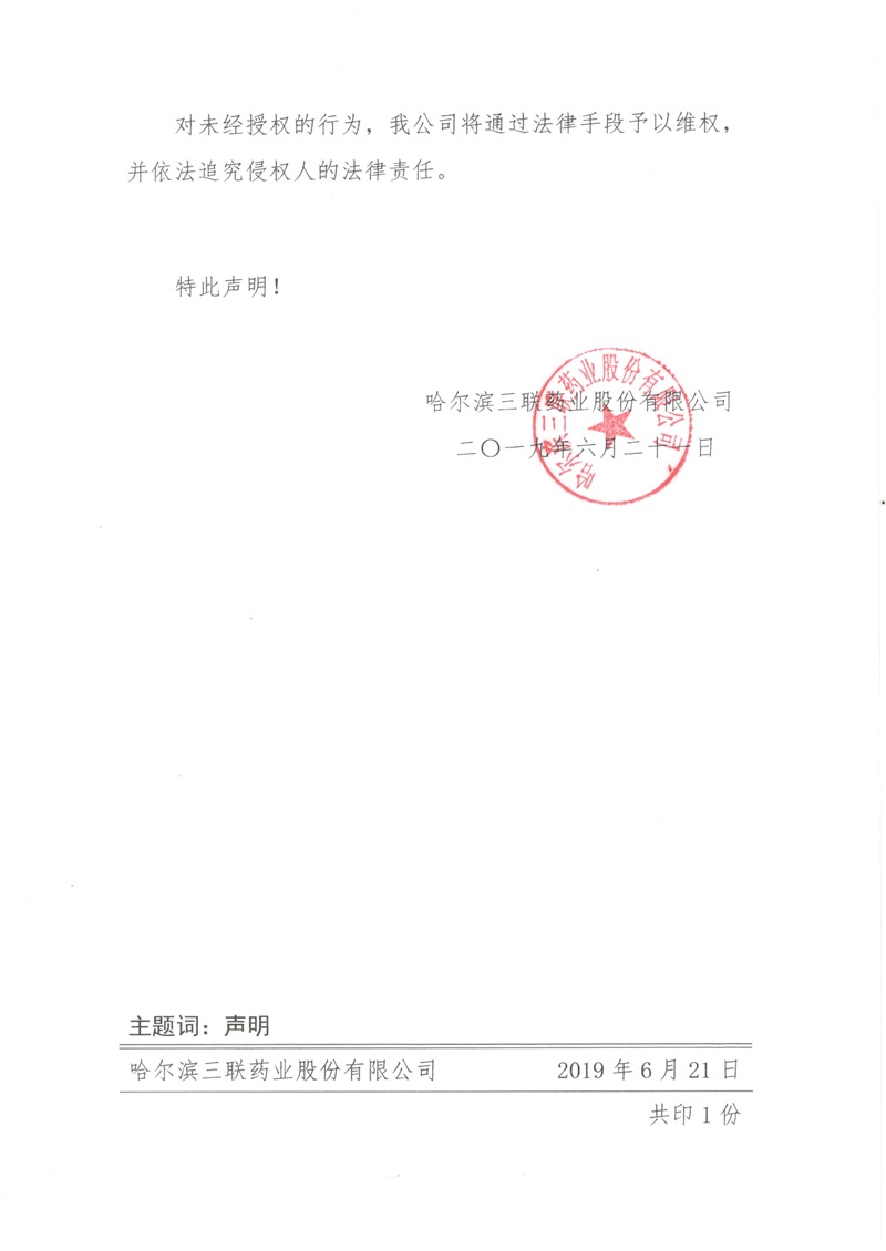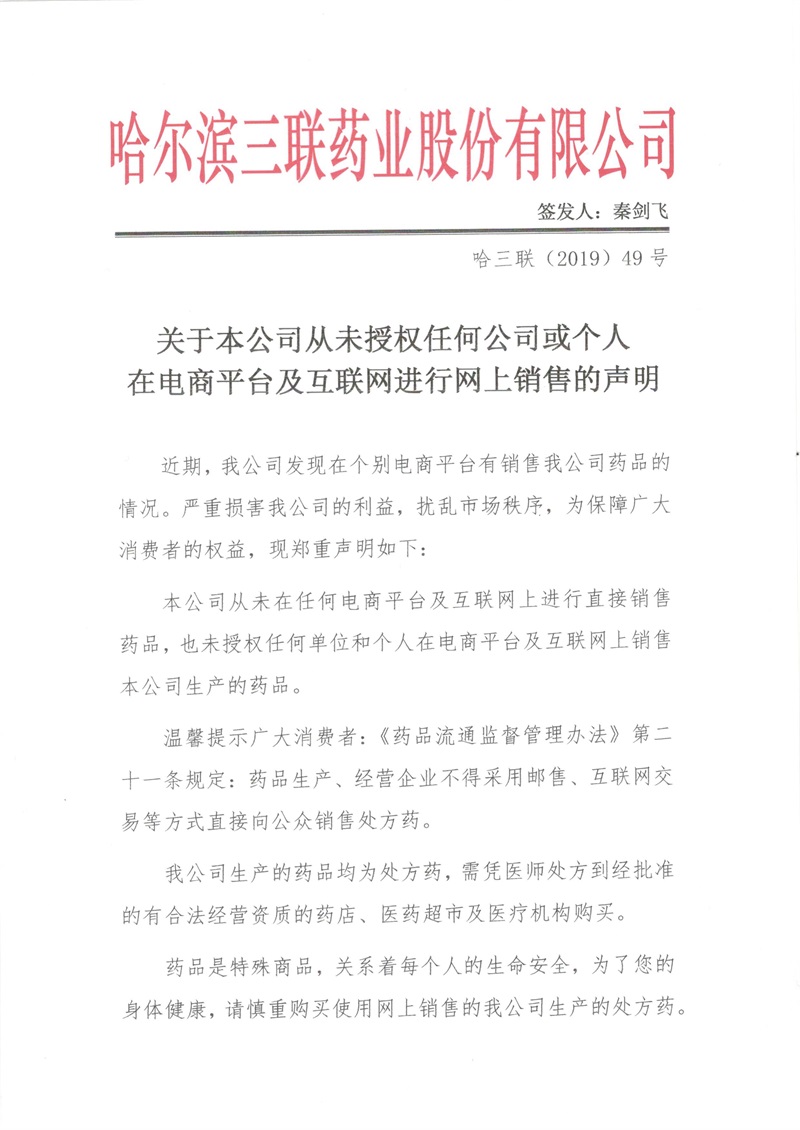 近期,我公司發(fā)現(xiàn)在個(gè)別電商平臺(tái)有銷售我公司藥品的情況。嚴(yán)重?fù)p害我公司的利益,擾亂市場(chǎng)秩序,為保障廣大消費(fèi)者的權(quán)益,現(xiàn)鄭重聲明: