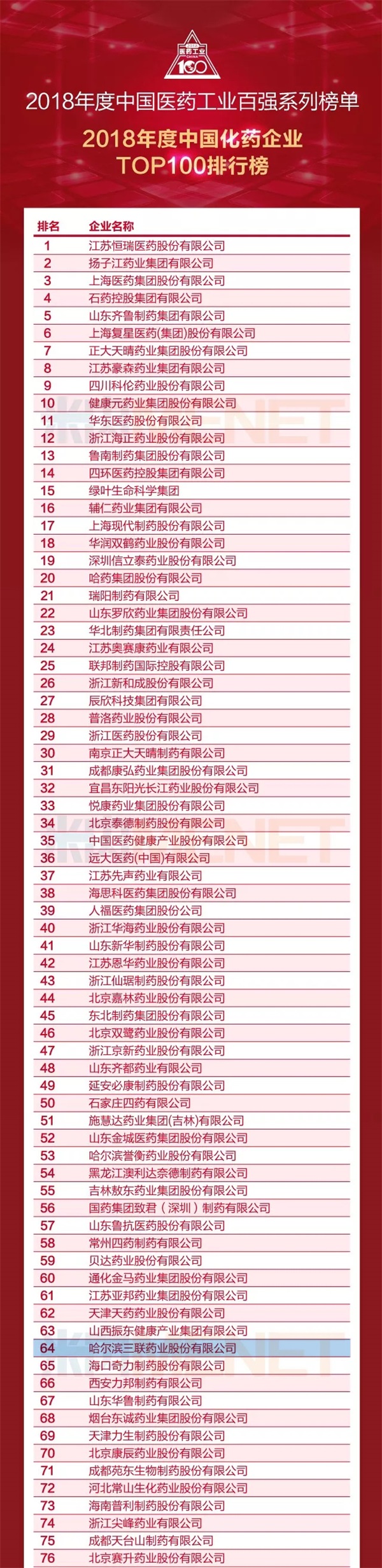7月15日,在山東濟南舉行的2019全國藥店周暨中國醫(yī)藥創(chuàng)新發(fā)展大會上,米內(nèi)網(wǎng)、醫(yī)藥經(jīng)濟報聯(lián)合發(fā)布了“2018年度中國醫(yī)藥工業(yè)百強系列榜單”,分為“2018年中國化藥企業(yè)TOP100”等5大子榜單,哈爾濱三聯(lián)藥業(yè)股份有限公司位列中國化藥企業(yè)TOP100排行榜第64位。