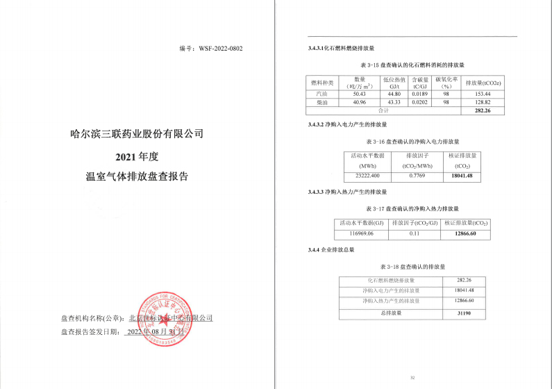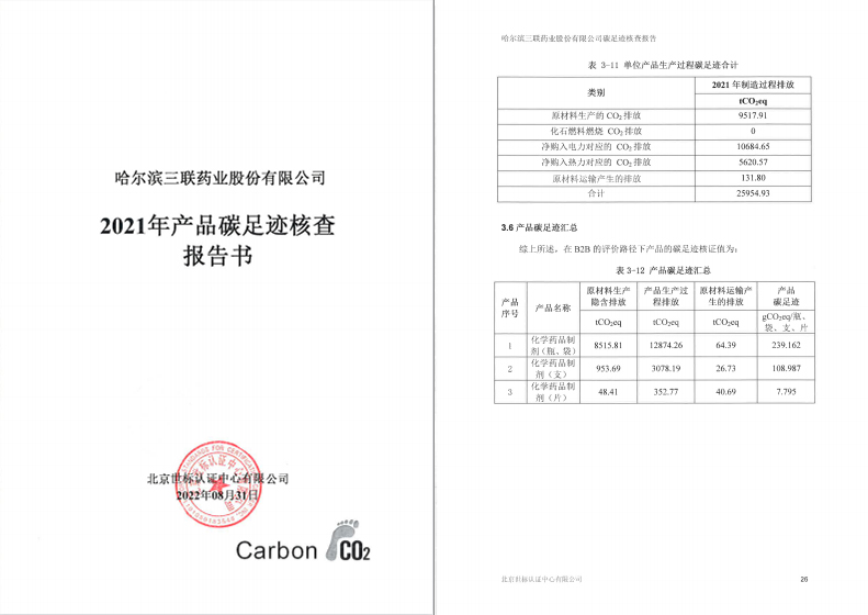 哈爾濱三聯(lián)藥業(yè)股份有限公司2021年溫室氣體排放盤查報告、2021年產品碳足跡核查報告的公示