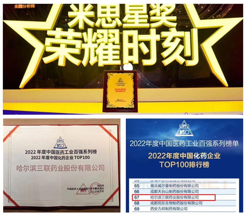 米內(nèi)網(wǎng)組織了中國醫(yī)藥工業(yè)百強排行榜專家委員會,依托米內(nèi)網(wǎng)在中國獨家開發(fā)運行多年的三大終端六大市場終端格局數(shù)據(jù)庫,針對醫(yī)藥工業(yè)企業(yè),從兩大最重要的維度(創(chuàng)新驅(qū)動力和專業(yè)推廣力)出發(fā),評選出了“2022年度中國醫(yī)藥工業(yè)百強系列榜單”。大會期間,多個權(quán)威榜單揭曉,哈三聯(lián)憑借扎實的研發(fā)生產(chǎn)實力和穩(wěn)健的市場推廣能力,成功入選“2022年度中國醫(yī)藥工業(yè)百強系列榜單”子榜單“2022年度中國化藥企業(yè)TOP100排行榜”,位列第67位。