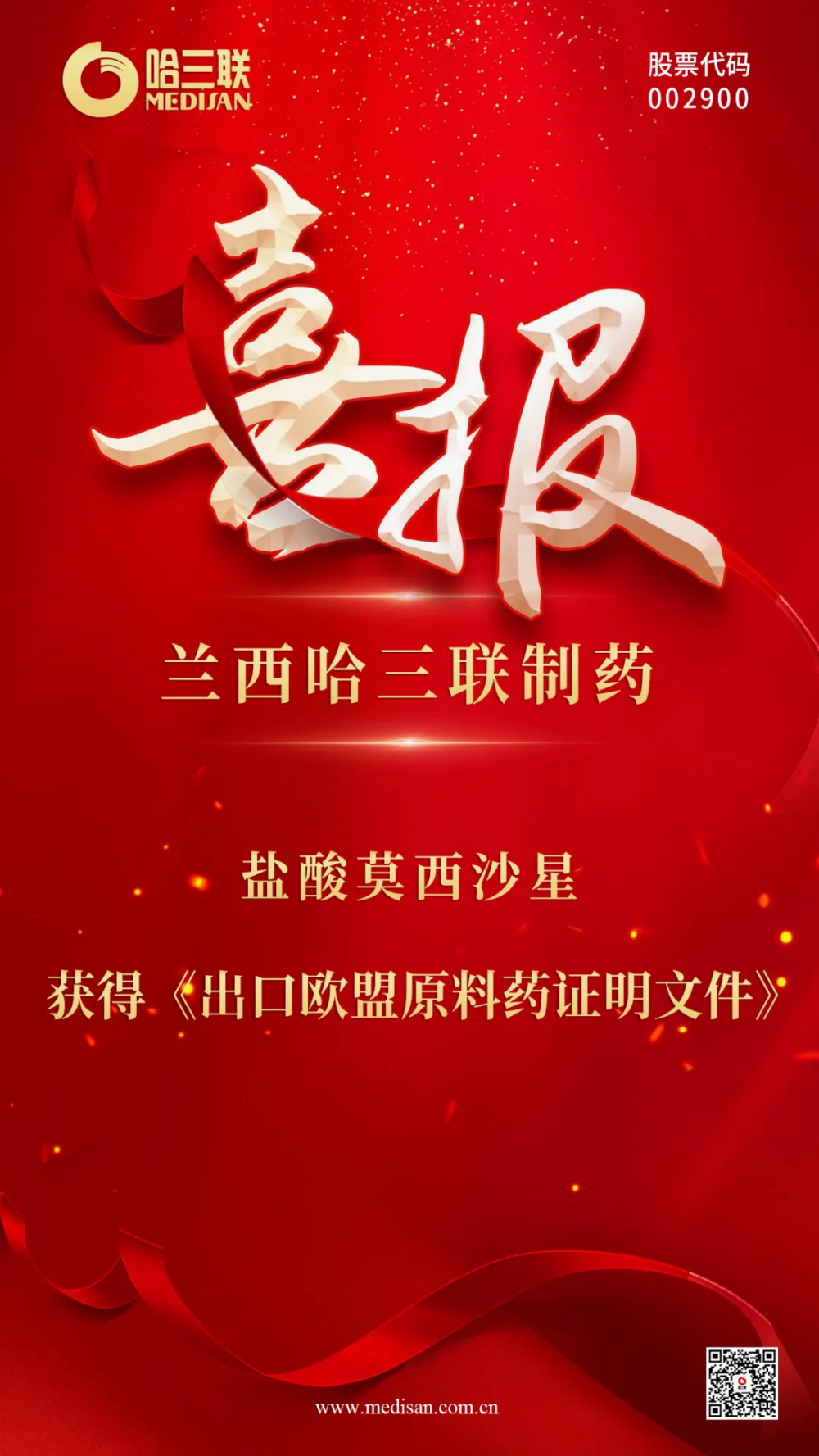 1月23日,哈三聯(lián)全資子公司蘭西哈三聯(lián)制藥生產(chǎn)的鹽酸莫西沙星獲黑龍江省藥品監(jiān)督管理局正式簽發(fā)的《出口歐盟原料藥證明文件》,迎來公司原料藥國際化新突破,為進(jìn)一步拓展歐洲市場(chǎng)、深化國際合作提供有力保障。