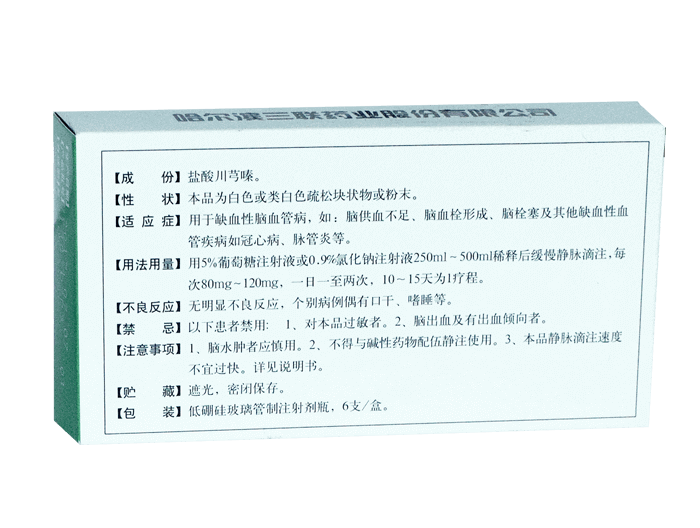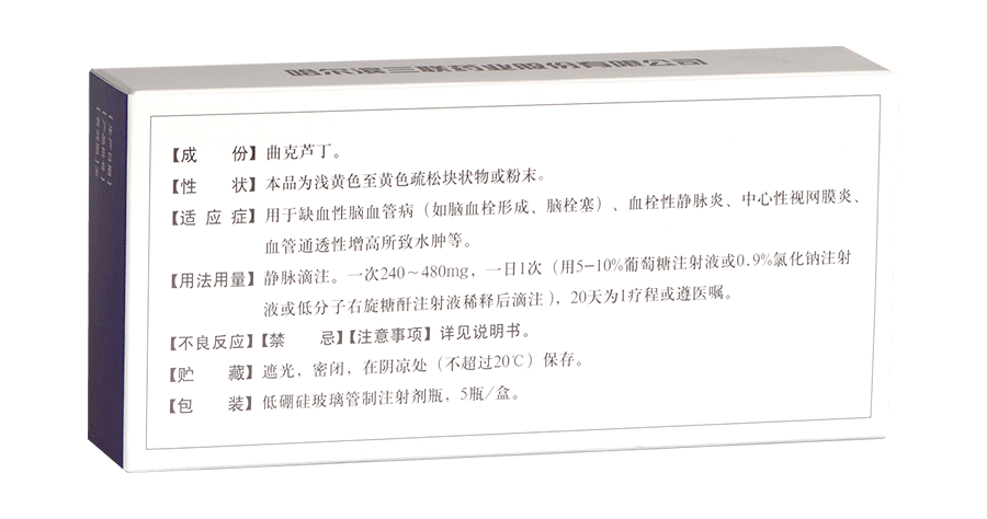 產(chǎn)品中心產(chǎn)品中心心腦血管系統(tǒng)類0451-51705160公司地址:黑龍江省哈爾濱市利民經(jīng)濟(jì)開發(fā)區(qū)北京路纈沙坦分散片【藥品名稱】纈沙坦分散片【商品名】維爾坦【批準(zhǔn)文號】國藥準(zhǔn)字H200610...【包裝規(guī)格】80mg×7片/盒、8...【適應(yīng)癥】治療輕、中度原...乙酰谷酰胺葡萄糖注射液【藥品名稱】乙酰谷酰胺葡萄糖...【批準(zhǔn)文號】國藥準(zhǔn)字H200416...【包裝規(guī)格】250ml:乙酰谷酰...【英文名】Aceglutamide an...【適應(yīng)癥】用于腦外傷性昏...注射用乙酰谷酰胺【藥品名稱】注射用乙酰谷酰胺【商品名】賽普利爾【批準(zhǔn)文號】國藥準(zhǔn)字H200408...【包裝規(guī)格】0.25g×2支/盒【適應(yīng)癥】用于腦外傷昏迷...注射用奧扎格雷鈉【藥品名稱】注射用奧扎格雷鈉【商品名】漢美達(dá)【批準(zhǔn)文號】國藥準(zhǔn)字H200566...【包裝規(guī)格】80mg(按奧扎格雷...【適應(yīng)癥】用于治療急性血...注射用腦蛋白水解 (III)【藥品名稱】注射用腦蛋白水解 ...【商品名】曲奧【批準(zhǔn)文號】國藥準(zhǔn)字H200512...【包裝規(guī)格】60mg(以總氮計(jì))...【適應(yīng)癥】用于顱腦外傷、...注射用曲克蘆丁【藥品名稱】注射用曲克蘆丁【商品名】元汀 【批準(zhǔn)文號】國藥準(zhǔn)字H200502...【包裝規(guī)格】0.48g×5支/盒【適應(yīng)癥】用于缺血性腦血...注射用鹽酸艾司洛爾【藥品名稱】注射用鹽酸艾司洛...【批準(zhǔn)文號】國藥準(zhǔn)字H200404...【包裝規(guī)格】0.1g×1支/小盒,5...【英文名】Esmolol Hydroch...【適應(yīng)癥】用于心房顫動(dòng)、...注射用鹽酸川芎嗪【藥品名稱】注射用鹽酸川芎嗪【商品名】川青【批準(zhǔn)文號】國藥準(zhǔn)字H200411...【包裝規(guī)格】40mg×10支/盒、...【適應(yīng)癥】用于缺血性腦血...注射用鹽酸地爾硫卓【藥品名稱】注射用鹽酸地爾硫...【批準(zhǔn)文號】國藥準(zhǔn)字H200457...【包裝規(guī)格】10mg×5支/盒【英文名】Diltiazem Hydro...【適應(yīng)癥】室上性心動(dòng)過速...注射用阿魏酸鈉【藥品名稱】注射用阿魏酸鈉【商品名】萊斯麗【批準(zhǔn)文號】國藥準(zhǔn)字H200594...【包裝規(guī)格】0.1g×6支/盒【適應(yīng)癥】用于缺血性心腦...葛根素注射液【藥品名稱】葛根素注射液【商品名】 博汀【批準(zhǔn)文號】國藥準(zhǔn)字H200336...【包裝規(guī)格】5ml:0.25g×6支/...【適應(yīng)癥】用于輔助治療冠...環(huán)磷腺苷注射液【藥品名稱】環(huán)磷腺苷注射液【商品名】天安欣【批準(zhǔn)文號】國藥準(zhǔn)字H200515...【包裝規(guī)格】2ml:20mg×10支/...【適應(yīng)癥】用于心絞痛、心...